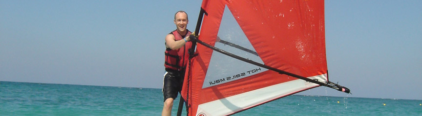 Photo par K. Cimon. Initiation à la planche à voile dans l'Atlantique. République Dominicaine, février 2007.